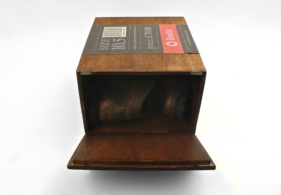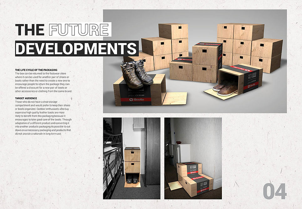 The intention behind ‘liquid wood shoe box’ concept was to convince the user to keep onto the packaging rather than throw it away. The shoe box packaging can be used as storage container and the same time convert into shoe storage cabinet by holding the boxes with neodymium magnets. The box can also be returned to the store where it would be used for another pair of boots for an exchange of a discount for a new pair of boots.